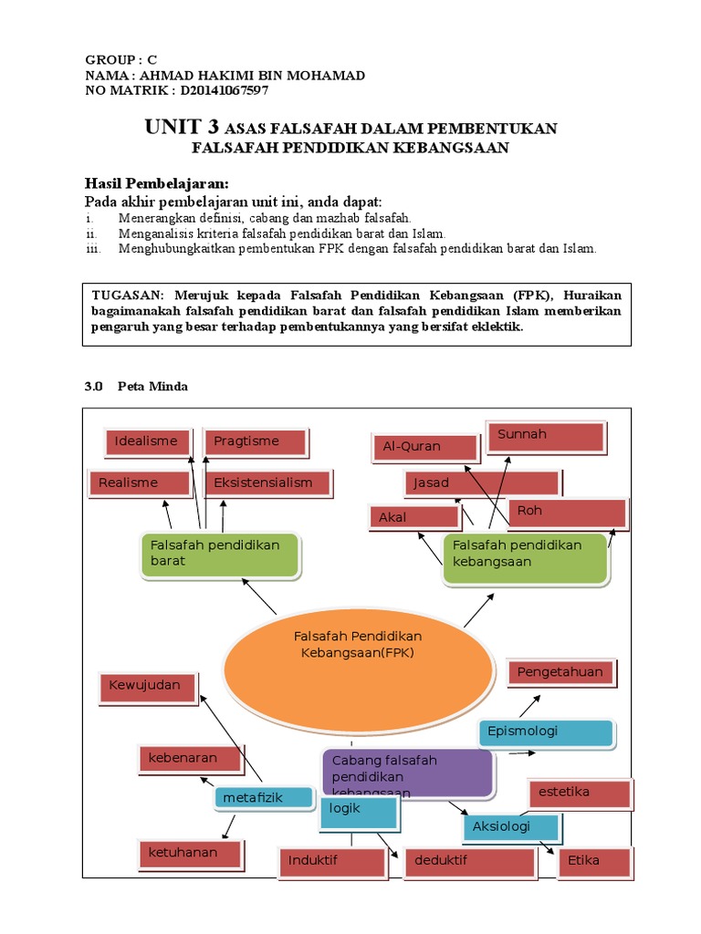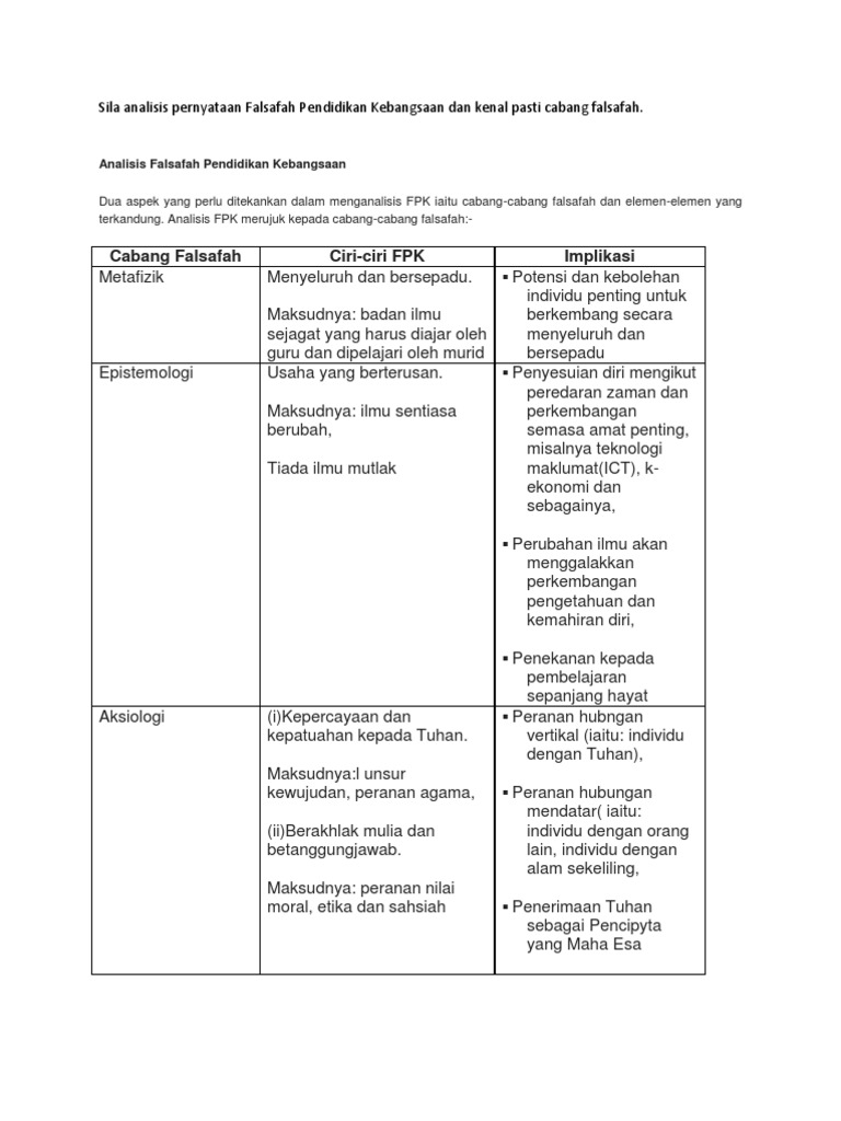Kajian definisi dan kelompok rujukan cabang berkenaan menghasilkan falsafah pendidikan kebangsaan (fpk) yang menjadi rujukan para guru dalam merealisasikan misi. Falsafah pendidikan kebangsaan berasal daripada tiga perkataan, iaitu falsafah, pendidikan dan kebangsaan. Pendidikan di malaysia adalah suatu usaha berterusan ke arah memperkembangkan lagi potensi individu secara bila idea dan falsafah pendidikan kebangsaan dibuat idea membentuk fpk ini sebenarnya adalah pada 1979 iaitu selepas penerbitan laporan. Alhamdulillah, bersyukur ke atas ilahi dengan limpahan rahmat serta nikmat masa, nyawa, dan tenaga yang di anugerahakan kepada saya dapat juga saya menyiapkan tugasan ini dengan jayanya. Islam intelek, rohani, jasmani intelek, jasmani.