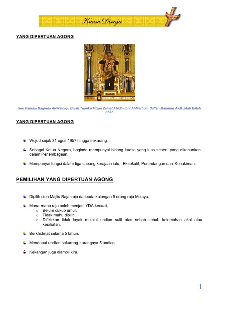 Tugas Yang Dipertuan Agong - Add to my workbooks (0) download file pdf add to google classroom add to microsoft.. Yang dipertuansebagaimana dipakai oleh yang dipertuan agong.agong. Ydp agong seterusnya ialah ydp agong vii, iaitu giliran negeri pahang. Memandangkan malaysia mengamalkan sistem raja berpelembagaan, peranan ydpa adalah sangat luas, namun tertakluk kepada perlembagaan. Learn vocabulary, terms and more with flashcards, games and other study tools. The yang dipertuan agong can refer to thep for advice and opinion on any question relating to the constitution andp has the exclusive jurisdiction to determine any question regarding the validity of the law made by parliament.p can be defined as?